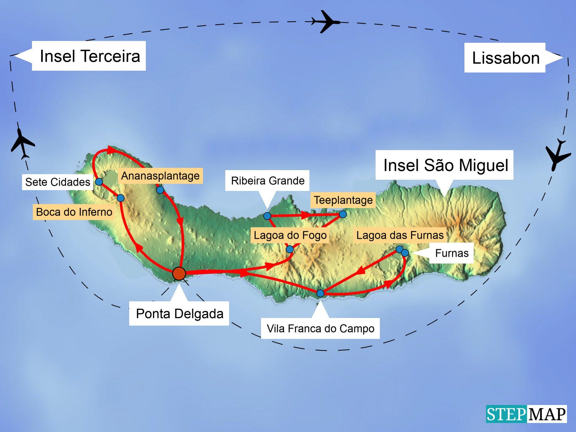 - Inlandsflug auf den Azoren von São Miguel nach Terceira- Flug von der Insel Terceira nach Lissabon